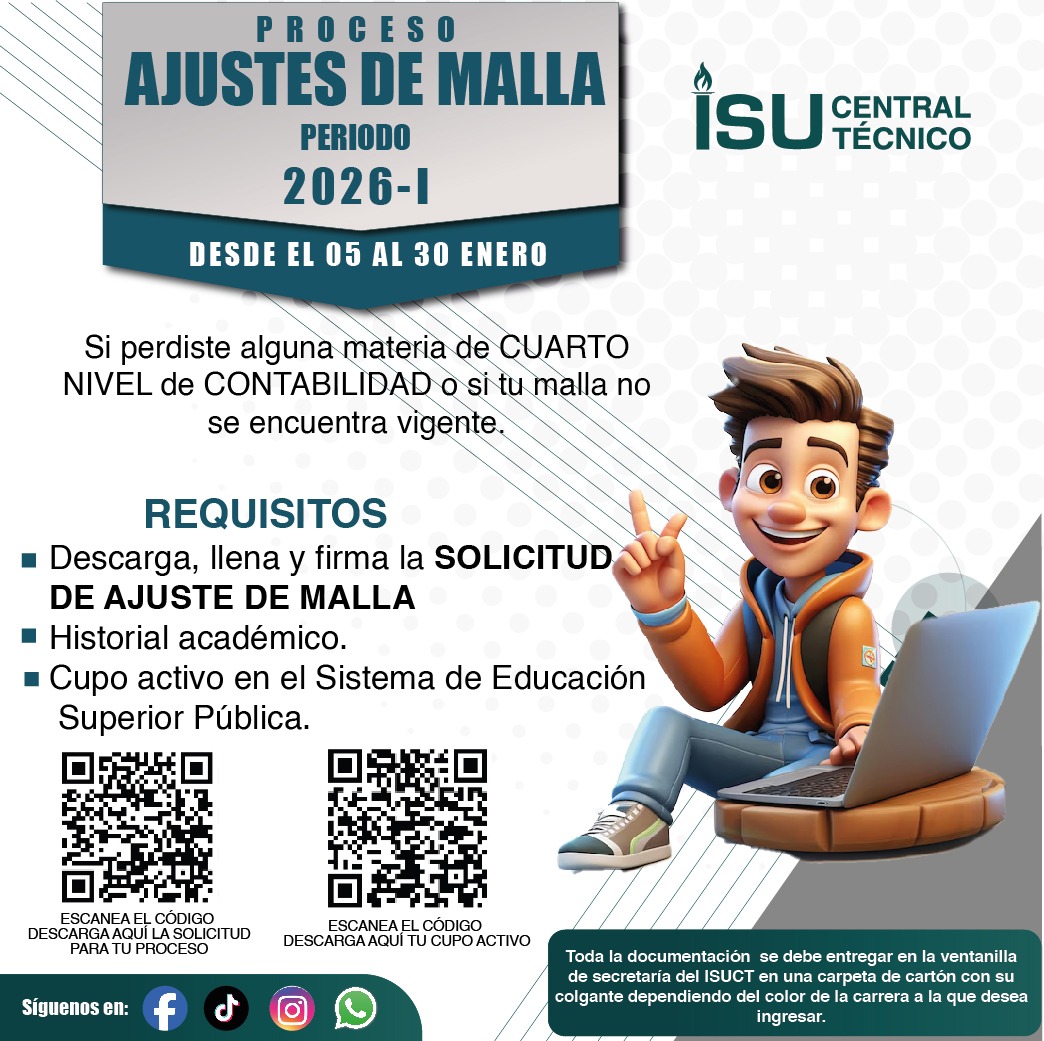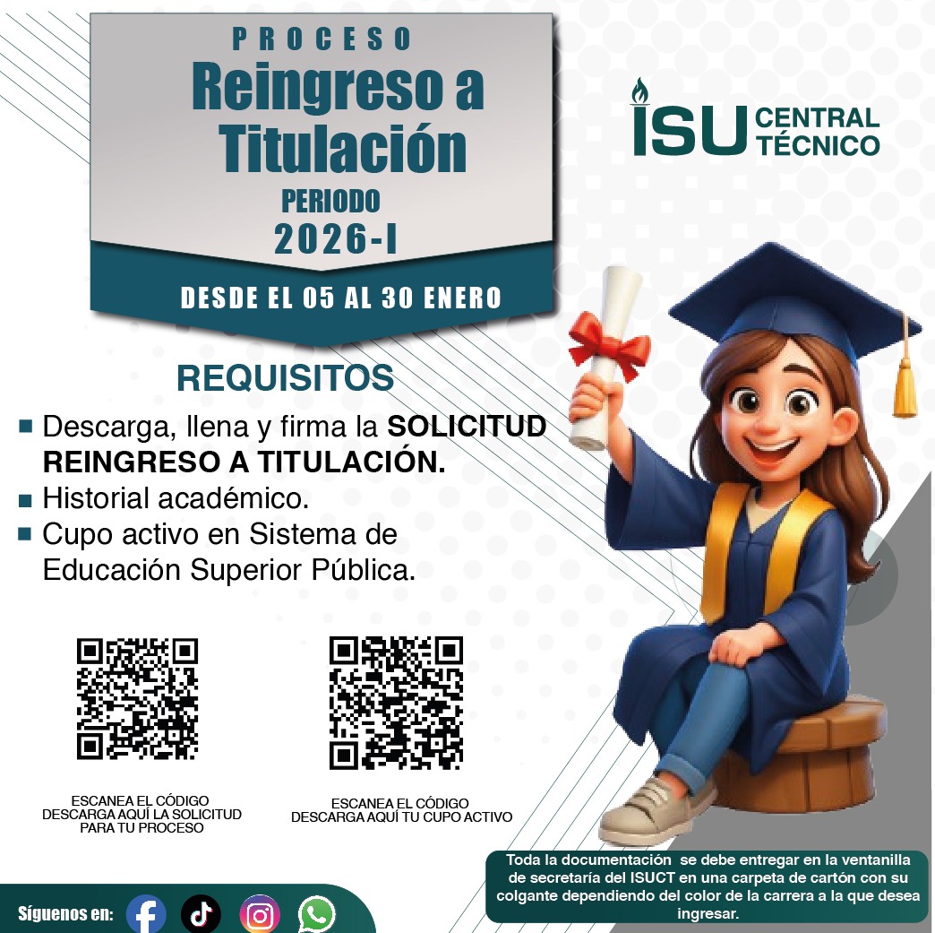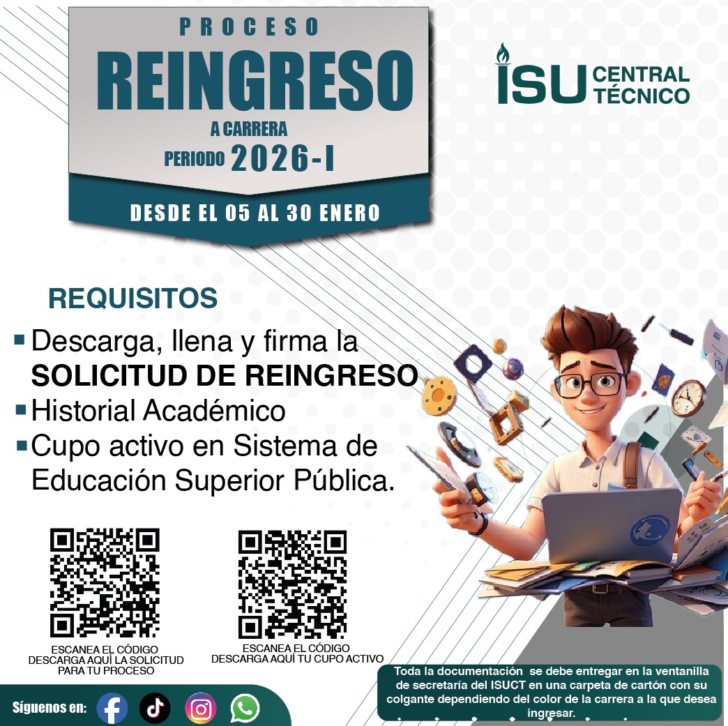 SERVICIOS ACADÉMICOS Aula Virtual Correo Registro Unico Senescyt SIGA GIA GIA Idiomas Mesa de Soporte Buzón de Sugerencias Transparencia Normativas y Reglamentos ISUCT Formato Solicitudes Biblioteca Digital ISUCT PERIODO ACADEMICO Proceso de Matrícula 2025 I NOTICIAS ISUCT CARRERAS TECNOLÓGICAS ISUCT CARRERAS TECNOLÓGICAS UNIVERSITARIAS ISUCT SERVICIOS PUBLICACIONES Rendición de cuentas ISUCT Rendición de cuentas Otros Institutos Publicaciones Editoriales BIENESTAR INSTITUCIONAL FOLLETO INFORMATIVOBIENESTAR INSTITUCIONAL CODIGO DE ÉTICA FACEBOOK TIKTOK @itscentraltcnico VISITANTES: 773.359