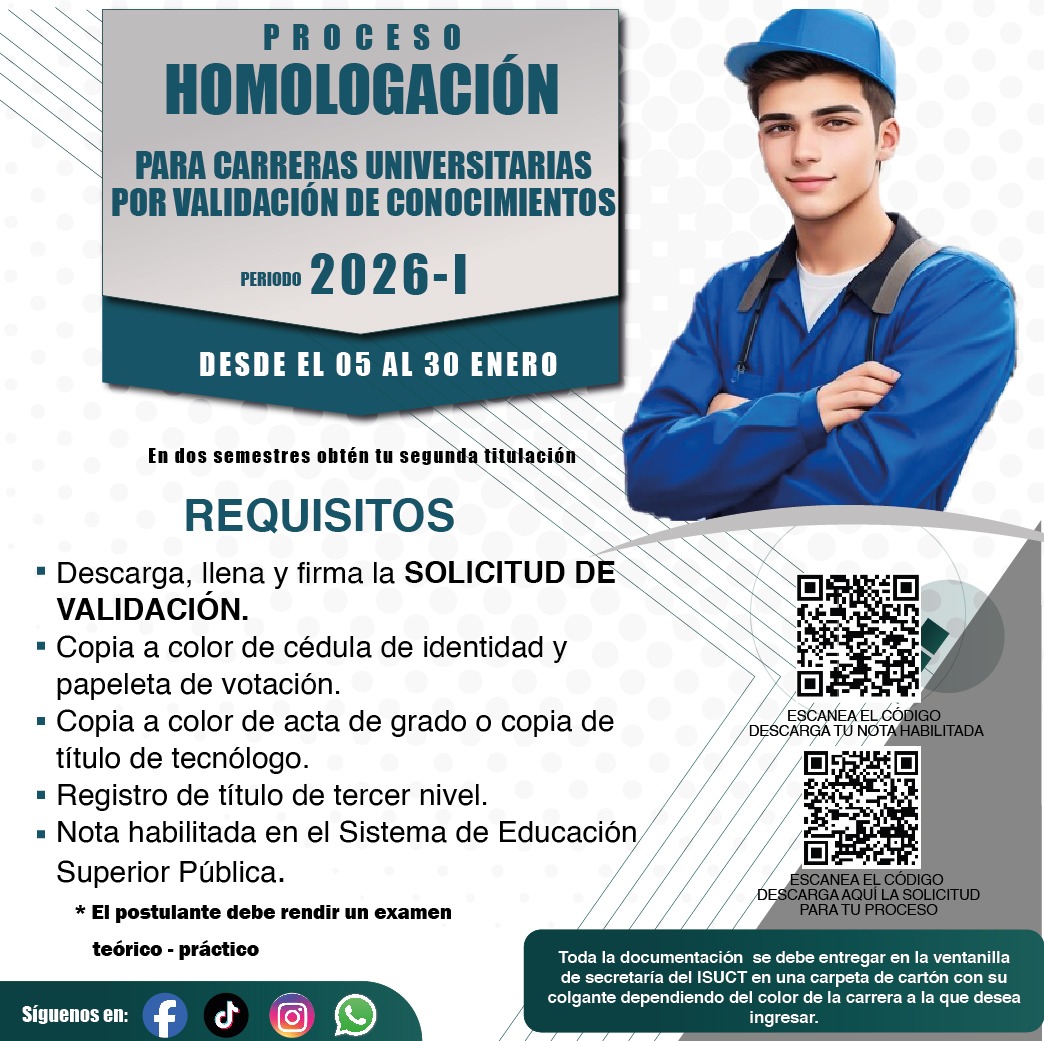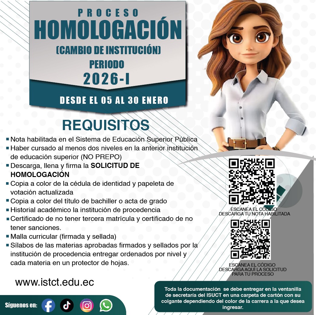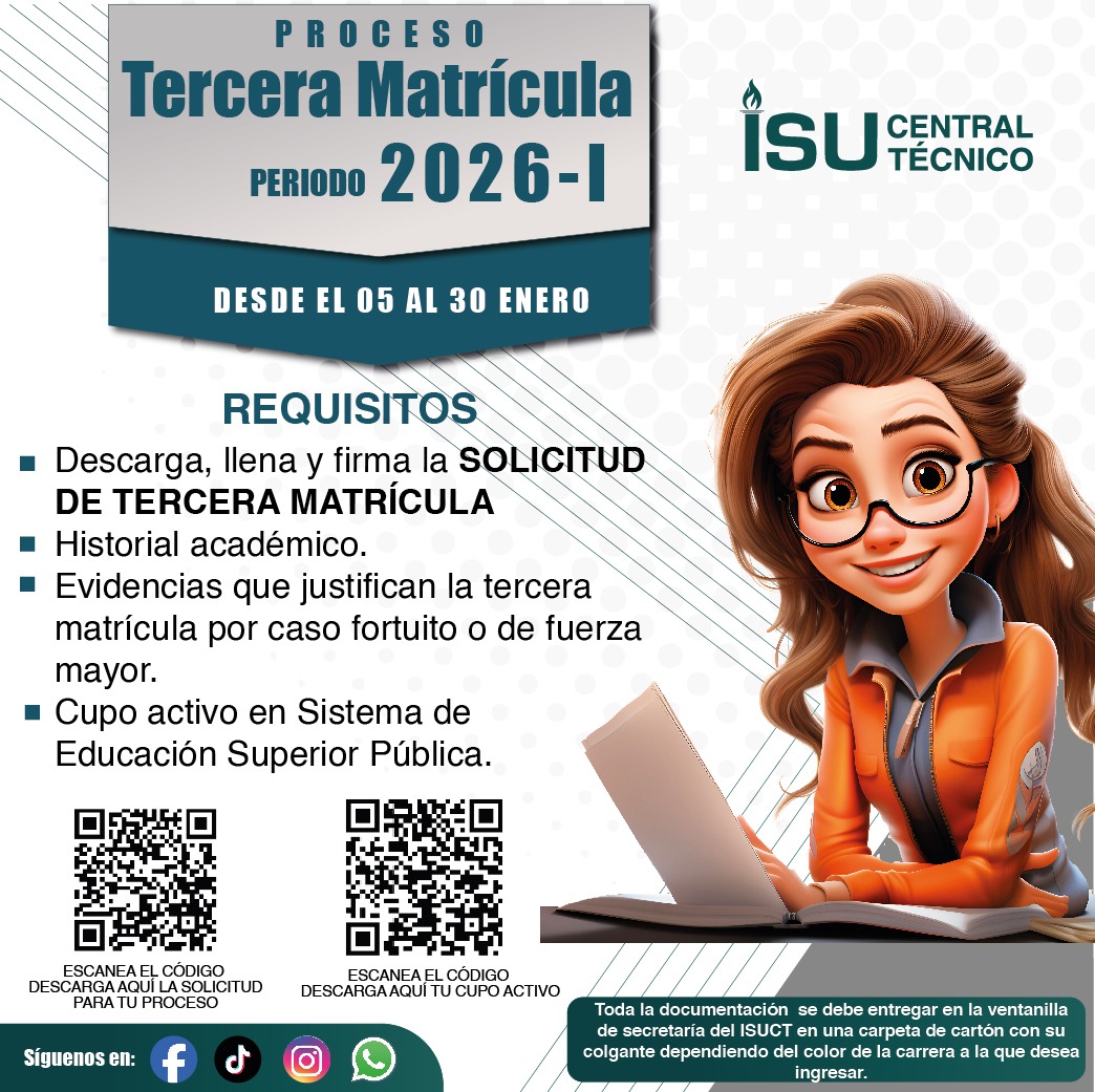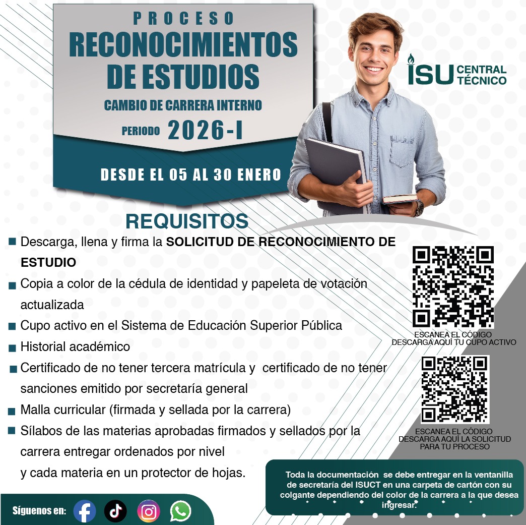 SERVICIOS ACADÉMICOS Aula Virtual Correo Registro Unico Senescyt SIGA GIA GIA Idiomas Mesa de Soporte Buzón de Sugerencias Transparencia Normativas y Reglamentos ISUCT Formato Solicitudes Biblioteca Digital ISUCT PERIODO ACADEMICO Proceso de Matrícula 2025 I NOTICIAS ISUCT CARRERAS TECNOLÓGICAS ISUCT CARRERAS TECNOLÓGICAS UNIVERSITARIAS ISUCT SERVICIOS PUBLICACIONES Rendición de cuentas ISUCT Rendición de cuentas Otros Institutos Publicaciones Editoriales BIENESTAR INSTITUCIONAL FOLLETO INFORMATIVOBIENESTAR INSTITUCIONAL CODIGO DE ÉTICA FACEBOOK TIKTOK @itscentraltcnico VISITANTES: 773.359